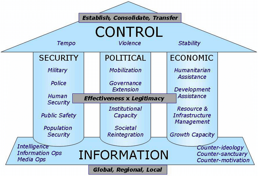 Така система була запропонована австралійським експертом із боротьби з повстанцями Девідом Кілкуленом і тримається на трьох стовпах: