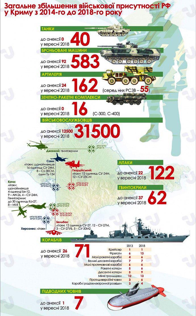Військовий контингент РФ в Криму цього року незалежні експерти оцінюють вже у 60 000 вояків. При цьому офіційне МО України в публічному просторі завжди намагається занизити ці цифри щонайменше в 2 рази.
