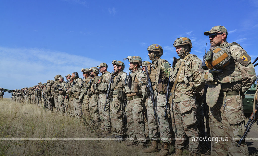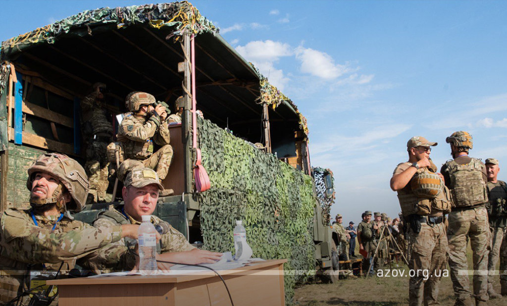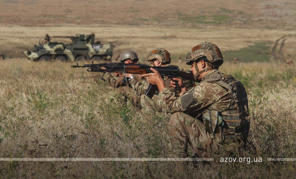 20 серпня на військовому полігоні «Урзуф» відбулися масштабні військові навчання з бойовою стрільбою за участі підрозділів Національної гвардії та Збройних сил України. Полк «Азов», особовий склад якого на час навчань був представлений у складі батальйонної тактичної групи «Азов», став основною одиницею загальновійськового резерву, залученою до навчань. БТГр «Азову» склали дві піхотні роти полку, танковий підрозділ, снайперська група, групи розвідки, інженерно-саперне відділення, мінометники, артилеристи, бійці зенітного ракетного підрозділу та інші сили. Вперше на навчаннях такого рівня була продемонстрована майстерність азовців у справі безпарашутного десантування, здійсненого з кабіни Мі-8, що на навчаннях представив військову авіацію спільно з екіпажами Су-25. Азовці продемонстрували професіоналізм надвисокого рівня та підтвердили готовність свого підрозділу якісно виконувати завдання за призначенням на передовій.