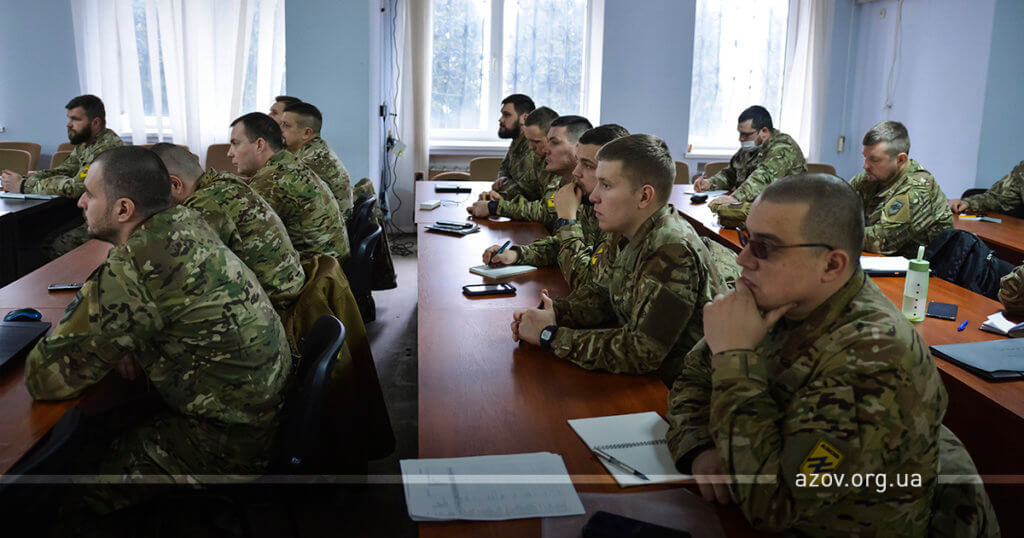 29 січня на гарнізоні полку «Азов» відбулася лекція з основ Міжнародного гуманітарного права для заступників командирів з роботи із особовим складом. Прочитав її представник міжнародної гуманітарної організації «Женевський заклик» Артем Конопкін.