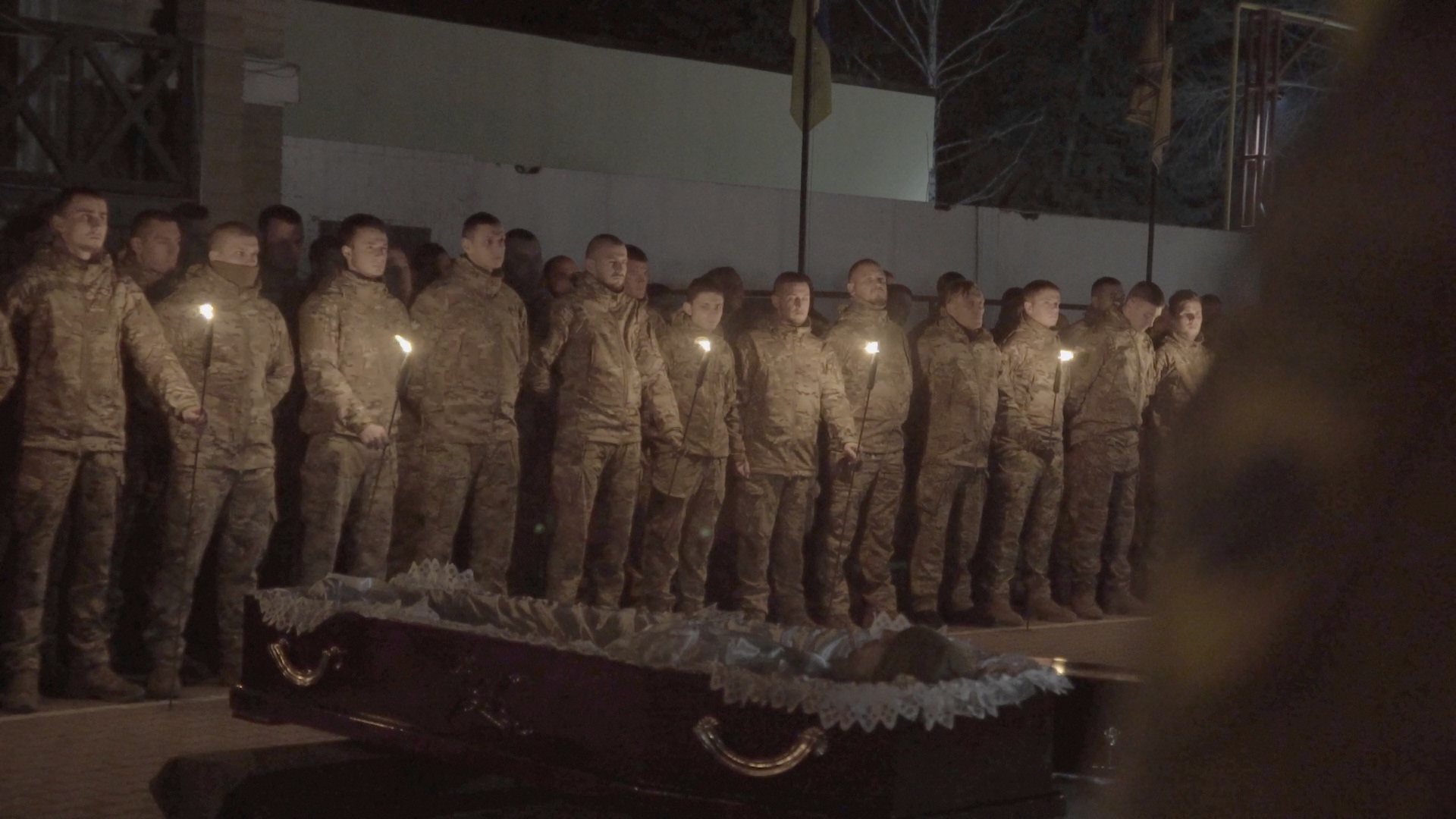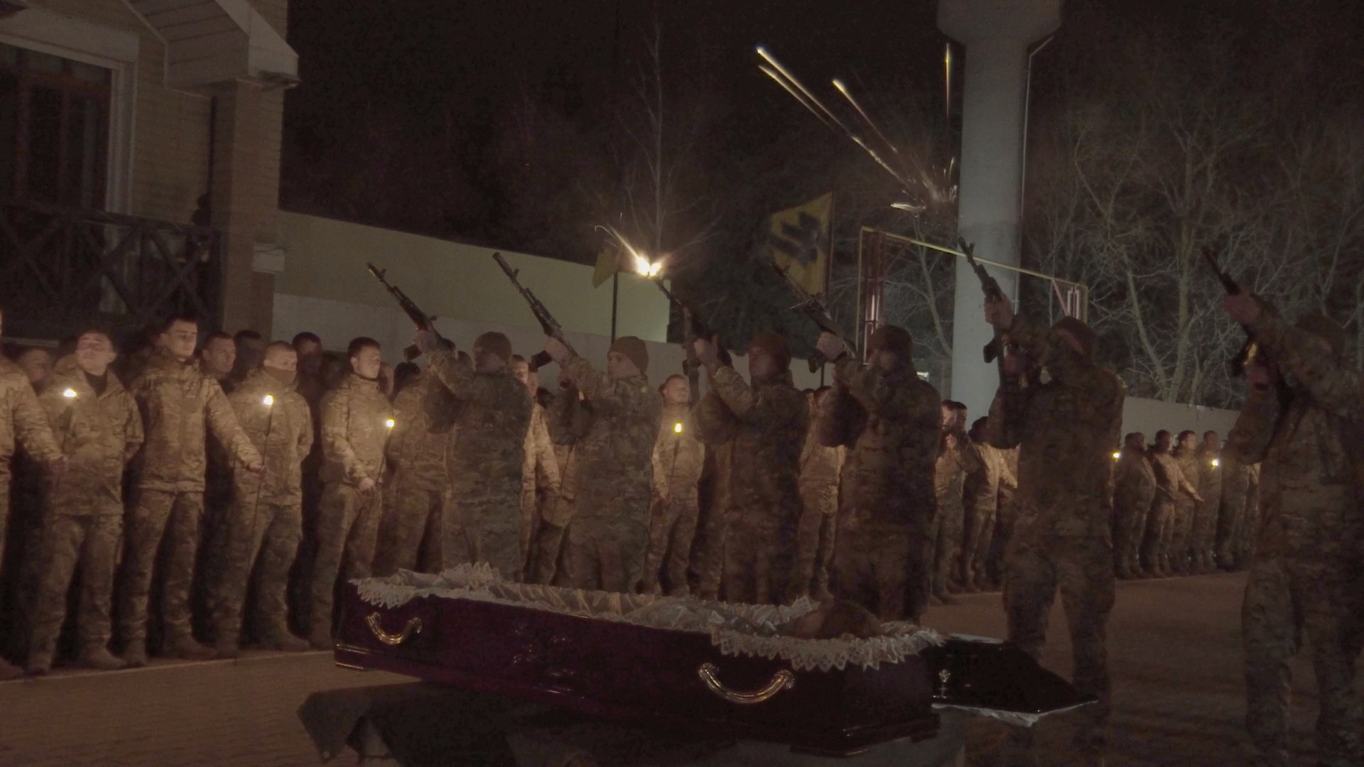 Сьогодні для прощання з Марком на базу полку АЗОВ в Урзуф прибув весь особовий склад підрозділу. При світлі факелів у рядах азовців стояла скорботна безмовність. Важко проводжати в останню дорогу молодого хлопця, товариша по зброї, який ще кілька днів тому сміявся, жартував, воював проти загарбника і планував своє життя після закінчення війни… Перед строєм взяв слово командир 3-ї роти 1-го батальйону друг Раз-Два: «Упрямий прийшов захищати Україну, щойно йому виповнилось 18 років. Він був людиною, яку в цивільному житті можна було назвати найкращим другом, а в окопах на передовій – найкращим воїном. Загинув Упрямий від кулі ворожого снайпера. Це дуже велика втрата як для підрозділу, так і для всієї України. Я сподіваюсь, що кожен з тих, хто зараз тут, при можливості помститись за Упрямого та інших наших полеглих братів обов’язково скористається нею і не промахнеться».