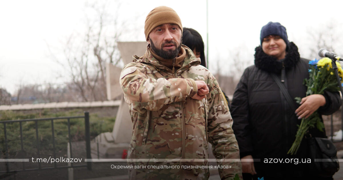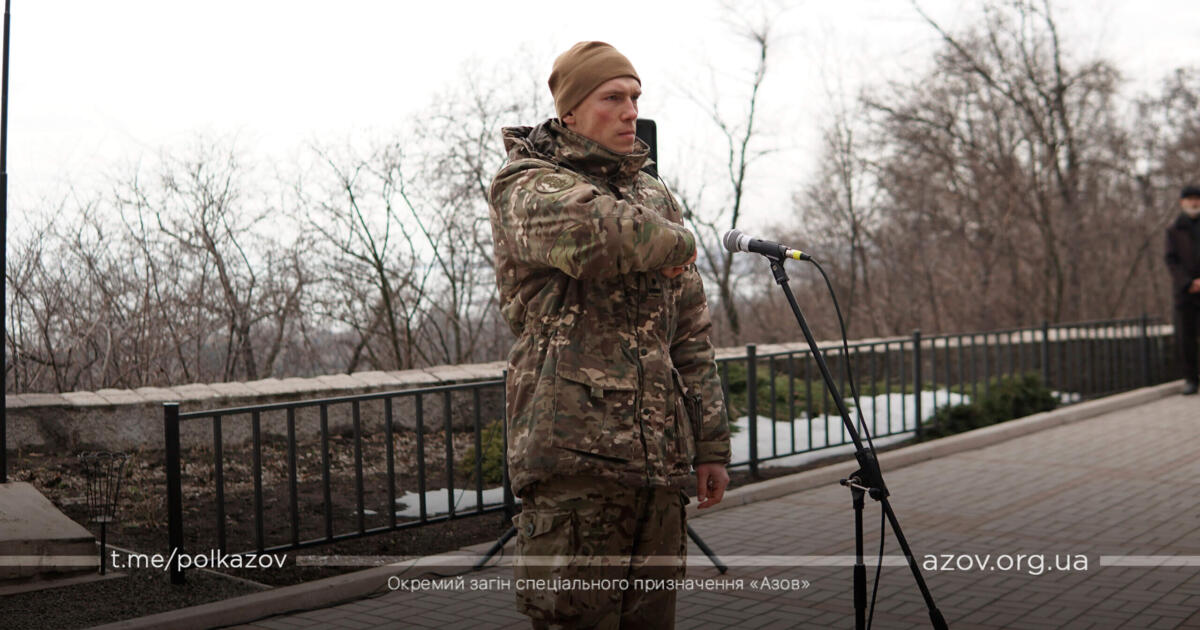Під час церемонії до присутніх звернувся командир полку «Азов» майор Денис Прокопенко (Редіс). Він пригадав буремні події семирічної давнини: