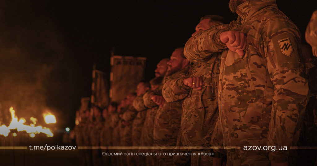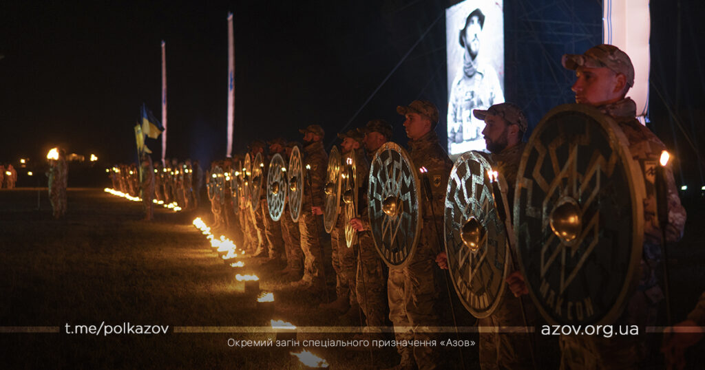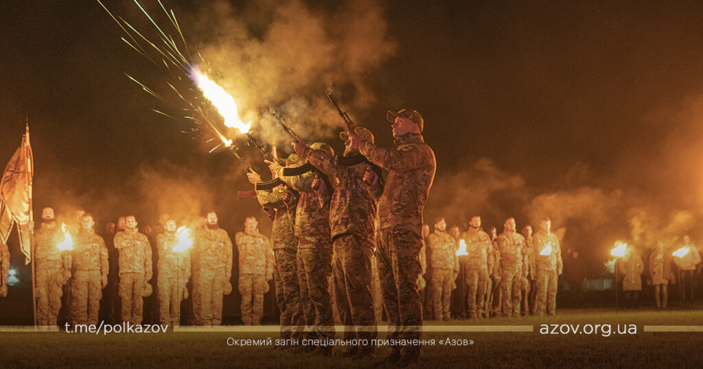 «У цей вечір ми традиційно вшановуємо пам’ять наших полеглих воїнів, вірних синів України, які віддали своє життя у боротьбі за незалежність нашої держави. «Азов» народився на фронті в той час, коли Україну поглинув суцільний хаос. Це, безумовно. був переломний момент в історії нашої держави, коли ми з вами реально могли втратити свою незалежність. З перших днів створення «Азов» ніколи не відмовлявся від виконання найскладніших і найнебезпечніших бойових завдань. Таким чином в червні 2014 року завдяки рішучим діям «Азову» Маріуполь було звільнено від проросійських терористів. А вже взимку 2015 року завдяки мужності та героїзму азовців, які загинули під час проведення Павлопіль-Широкинської наступальної операції, ворог був змушений відступити від околиць Маріуполя і з тих пір жодного разу не обстрілював з артилерії житлові квартали цього міста. З самого початку російсько-української війни на Донбасі силами «Азову» було знищено сотні проросійських бойовиків, відвойовано десятки кілометрів української землі та звільнено вісім населених пунктів, серед яких Маріуполь, Мар’їнка, Павлопіль, Лебединське, Широкине та інші. Вже восьмий рік «Азов» стоїть на захисті нашої держави. За час існування ми пройшли яскравий та нелегкий бойовий шлях. Сьогодні ми з гордістю згадуємо бойові операції, в яких безпосередню участь брав наш полк. На превеликий жаль, з цих боїв не повернулися живими наші бойові побратими, які назавжди залишилися в нашому строю. Їх імена навіки закарбовані в історії визвольних змагань за незалежність України. Імена, які ми сьогодні з вами згадаємо. Жодне віддане життя не є забуте, а лише розпалює полум’я наших сердець та надихає на подальшу боротьбу. Слава нації!»